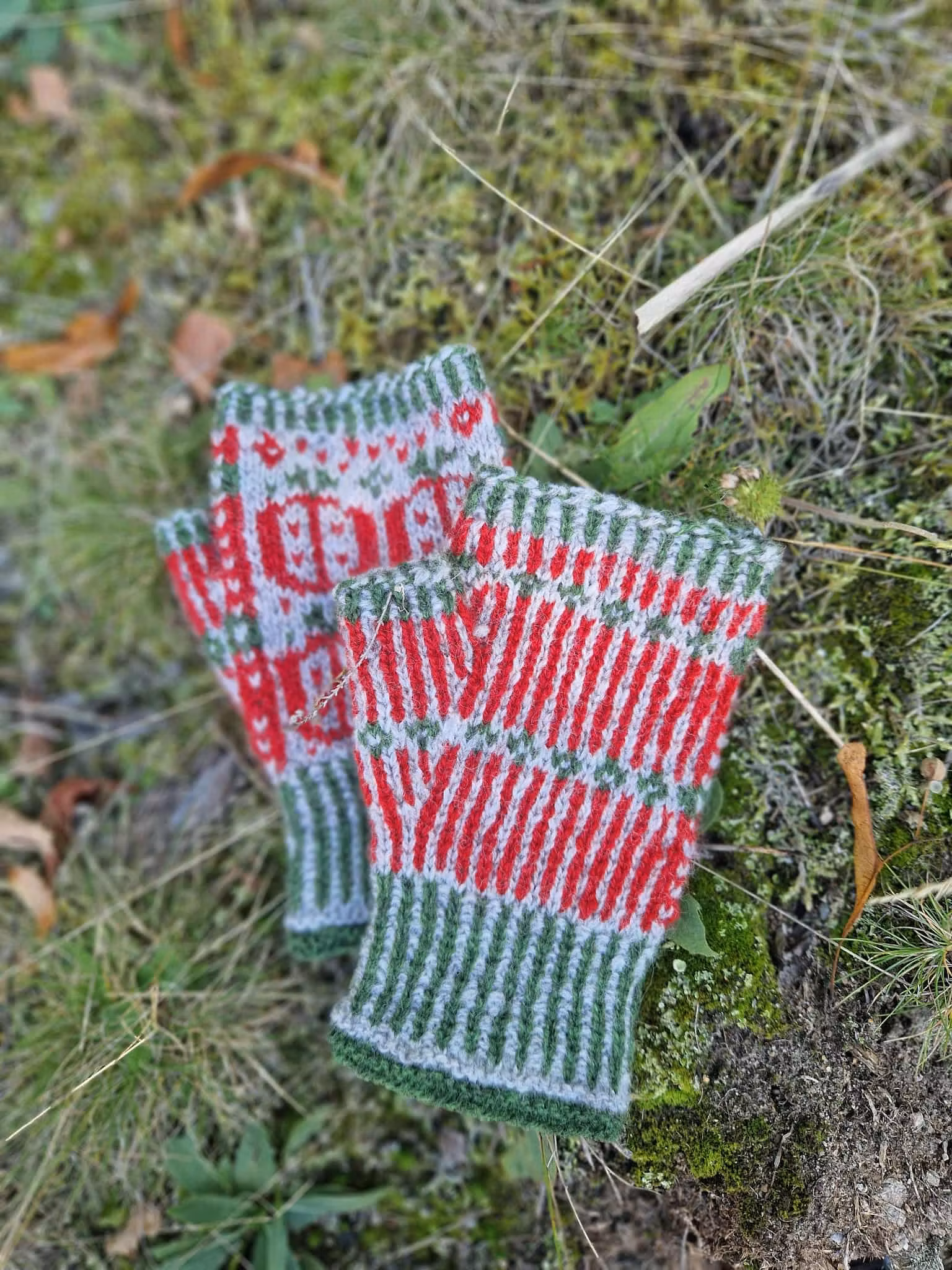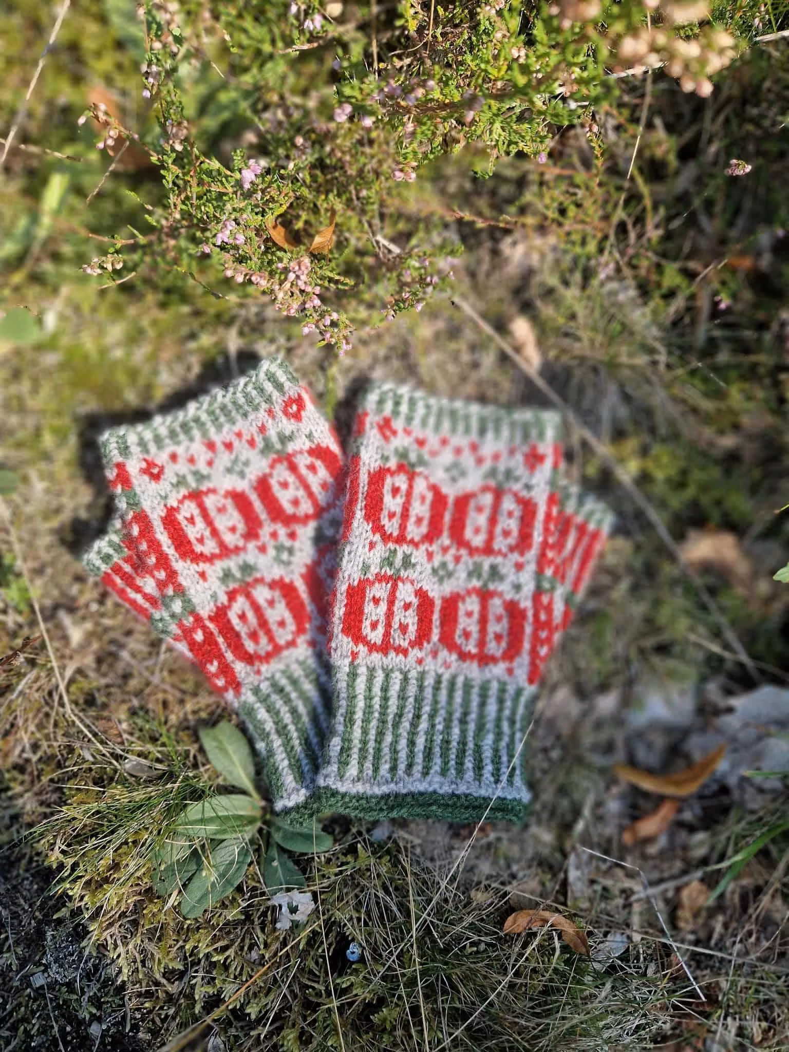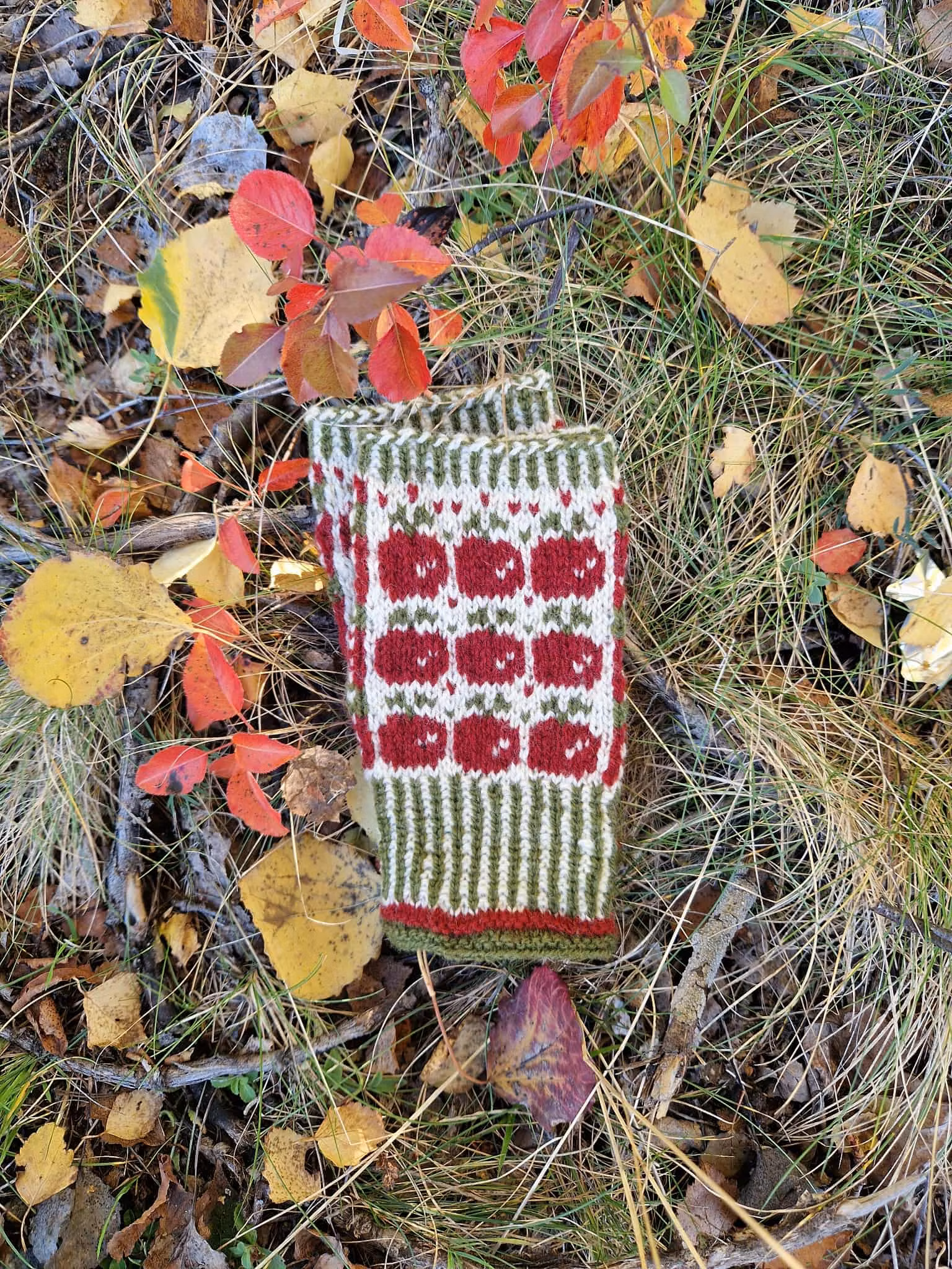 Apple mitts have a stranded colourwork design. The cuff starts with a garter stitch edge in two colours followed by a two coloured ribbing. Depending on your preference you can choose between two different kind of apples.