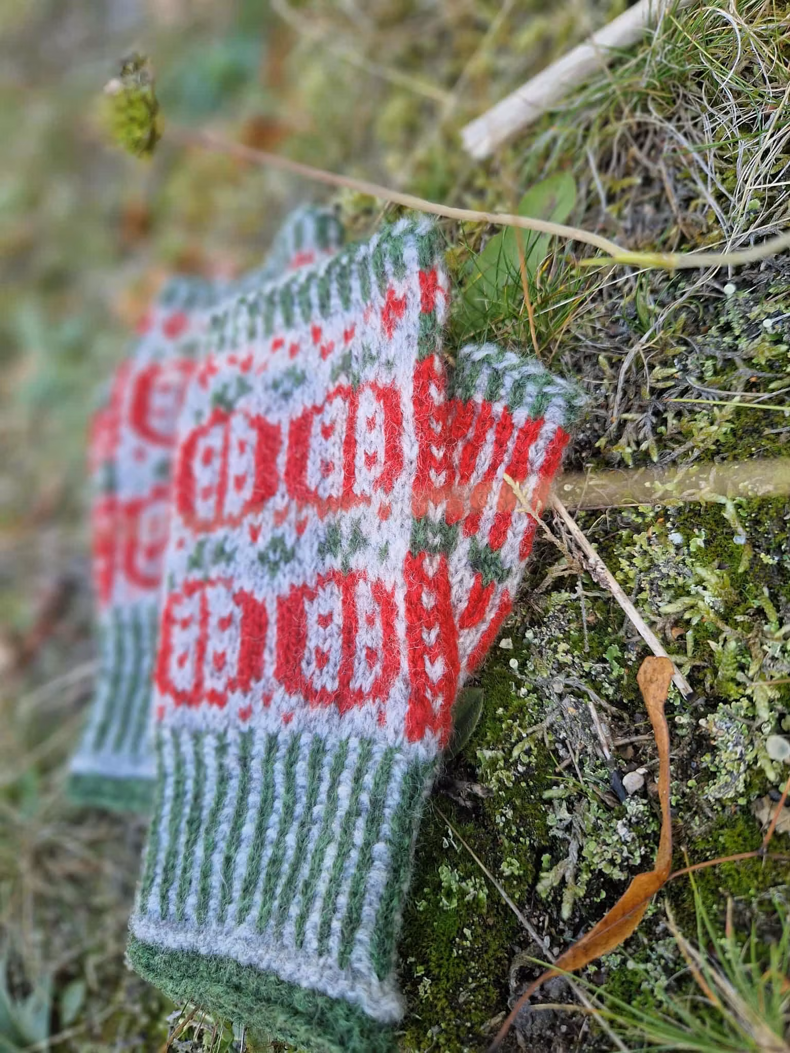 Vanten Äpple är en halvvante som stickas med två färger. En rätstickad kant pryder vantens topp och sedan följer 1x1 resår med två färger, varefter det stickas ett flerfärgsstickat äpplemönster. När det kommer till själva äpplemönstret kan du välja mellan att sticka halva äpplen (diagram A) eller hela, lite mindre, äpplen (diagram B).